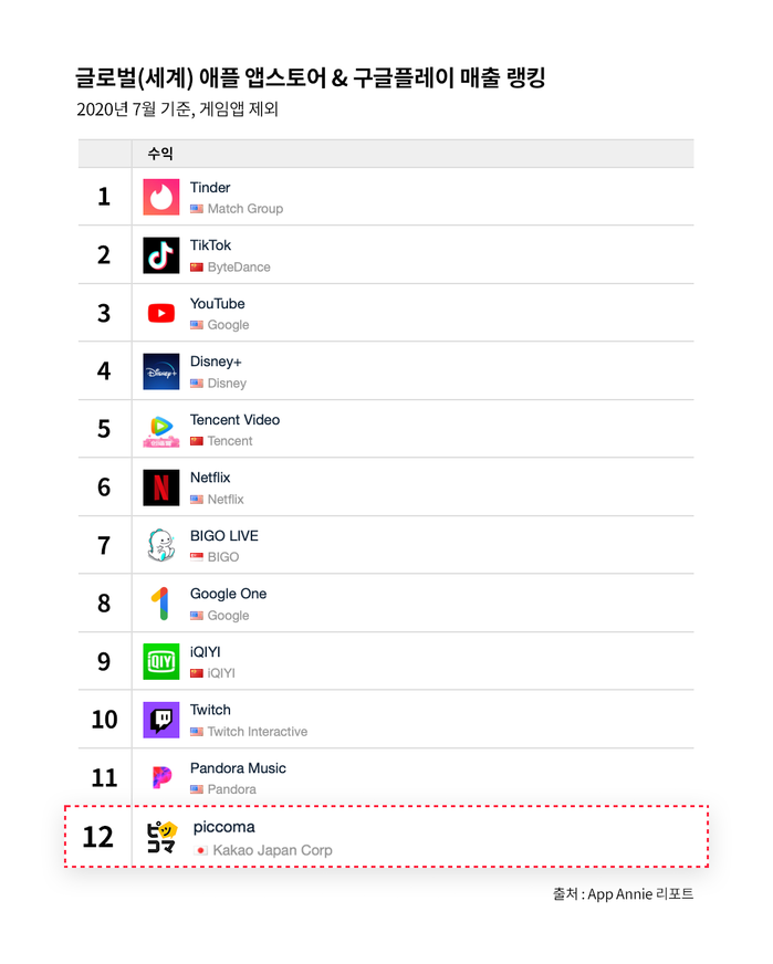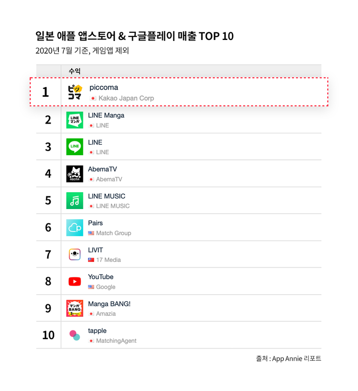 글로벌 앱 조사업체인 앱애니의 조사결과에 따르면 픽코마는 지난 달 월간 기준 일본 양대 앱마켓(애플 앱스토어, 구글 플레이스토어)에서 비게임 부문 모든 앱 중 통합 매출 1위에 올랐다. 같은 달 전 세계 기준으로는 12위에 해당하는 순위다.