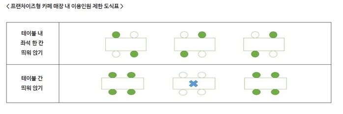 다만 매장 내 이용인원이 제한된다. 한 테이블 내 좌석 한 칸 띄워앉기 또는 테이블 간 띄워앉기가 실시된다.