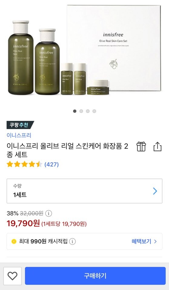 ▲ (위) 14일 명동 이니스프리 매장에서 판매되고 있는 '올리브 리얼 스킨케어 세트(3만2000원)' (아래) 14일 쿠팡에서 판매되고 있는 '올리브 리얼 스킨케어 세트(1만9790원)' (사진=팩트인뉴스 김민주기자) |
