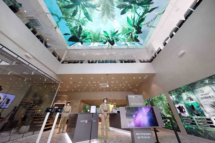 실제로 건물 안에 들어가자, 대로변의 혼잡한 소리는 멀어지고, 숲 속의 바람 소리와 새 소리가 들려왔다. 자연을 닮은 은은한 향기도 풍겼다. 천장과 벽면 모두 대형 미디어월이 설치돼 있어 각각 하늘과 숲 속의 모습이 비춰졌다.