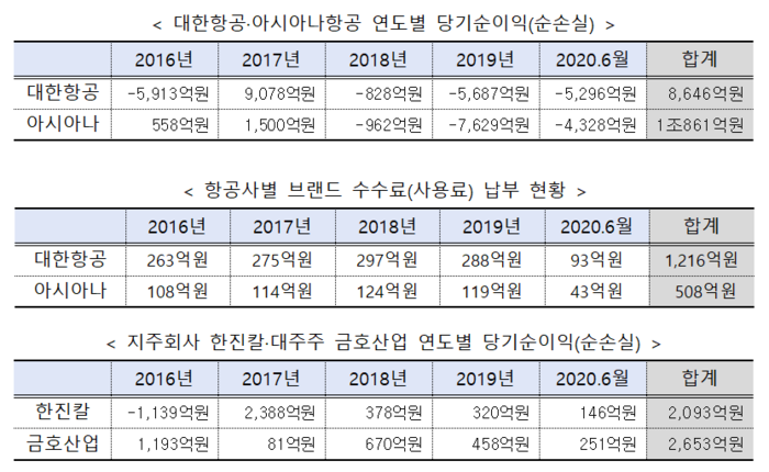 대한항공은 2016년 -5913억, 2018년 -828억, 2019년 -5687억 2020년(6월 기준) -5296억 등 지속적으로 수천억대 손실을 보이고 있음에도 한진칼에 대해 매년 평균 280억, 지난 5년간 총 1216억의 상표권 사용료를 지급했다.