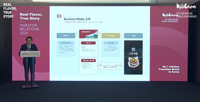 | ▲ 22일 황학수 교촌에프앤비 사장이 IPO 온라인 기자 간담회에서 발표하고 있다(출처=교촌 IPO 온라인 기자간담회 캡쳐) |