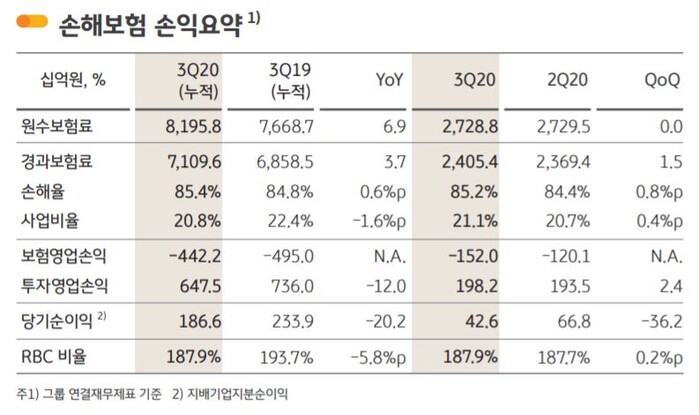 3분기 누적 당기순이익은 1866억원으로 전년 동기대비 20.2% 줄었다. 주로 자동차보험과 장기보험 손해율 상승으로 보험손익이 부진한데 기인했다는 설명이다.