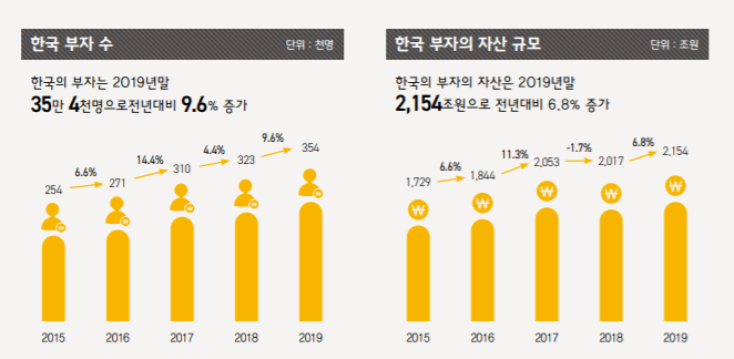 보고서에 따르면, 지난해 말 한국 부자 수는 35만4000명, 총금융자산은 2154조원으로 조사됐다. 한국 부자의 70.4%가 서울 및 수도권에 거주하는 것으로 나타났다. 지난 10년간 한국 부자 수 2.2배 증가, 총금융자산 규모는 1.9배 증가했다.