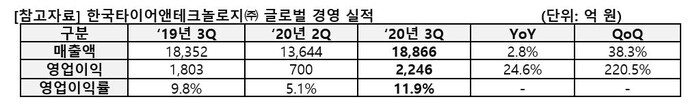 한국타이어는 2020년 3분기 연결 재무제표 기준 매출액 1조 8866억원, 영업이익 2246억원으로, 전년 동기 대비 각각 2.8%, 24.6% 동반 증가했다고 2일 공시했다. 전분기와 비교했을 땐 매출액은 38.3%, 영업이익은 220.5% 증가했다.