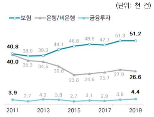4일 업계에 따르면 보험사에 대한 민원건수가 2011년 4만800건에서 지난해 5만1200건으로 1만여건이 늘어났다. 같은 기간 은행(2만6600건)과 금융투자(4400건)의 민원건수와 대조되는 수치다. 이는 보험권역의 소비자 불만이 개선되지 않고 있다는 것으로 풀이된다.