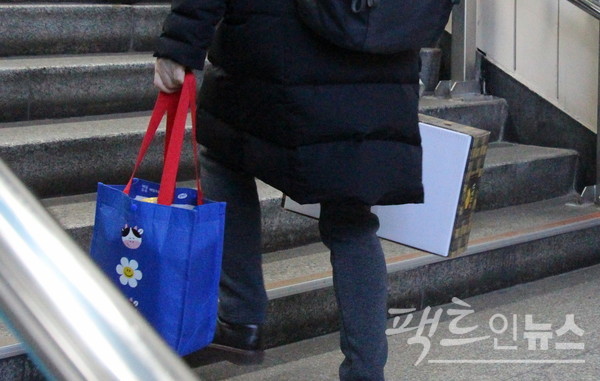 경기도 성남시 상대원동 공단에 있는 한 업체에서 근무하는 한 노동자가 야근을 마치고 22일 새벽 퇴근하고 있다. 한 손에는 회사가 지급한 설 선물이 들려 있다. [영상=정수남 기자]