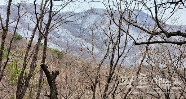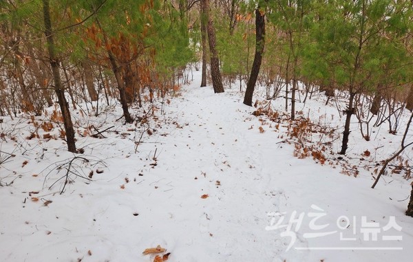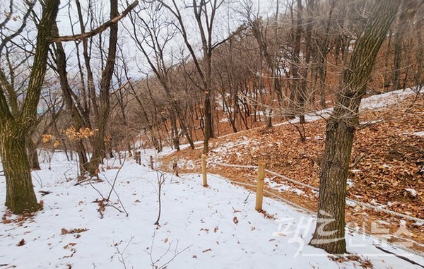 성남 중원구 망덕공원에서 검단산으로 이어 지는 등산로. 음지에는 눈이 쌓였으며, 양지는 마른 나뭇잎으로 덮였다. [사진=정수남 기자]