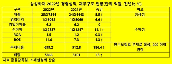 삼성화재의 지난해 부채비율은 699.2%로 전년보다 186.4%포인트 상승했다. 보험사의 경우 원수보험료가 부채로 잡히기 때문이다. 자본의 타인의존도(차입경영)를 뜻하는 부채비율은 통상 200 이하 유지를 재계는 권장하고 있다.