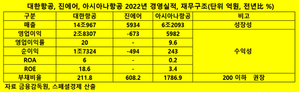 지난해 대한항공의 총자산순이익률(ROA)과 자기자본이익률(ROE)은 각각 6%, 18.6%로 전년보다 3.8%포인트, 10.2%포인트 상승했다. ROA, ROE는 영업이익률과 함께 기업의 수익성 지표다.