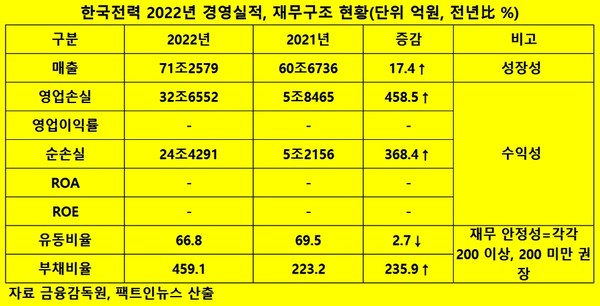 한전의 부채비율도 전년 223.2%에서 지난해 459.1%로 상승했다. 이는 정승일 사장이 빚을 내 경영을 지속하고 있다는 뜻이다.