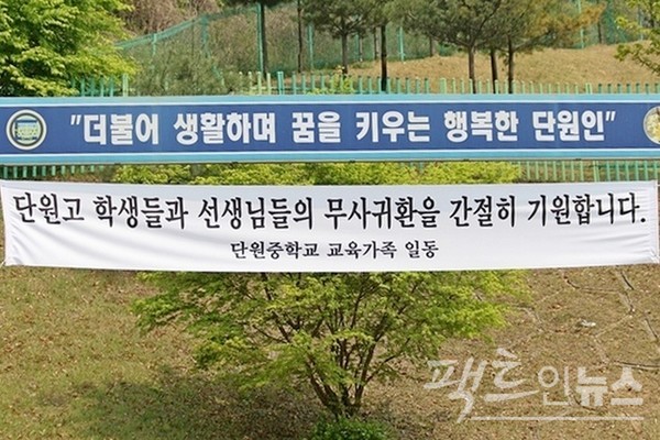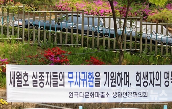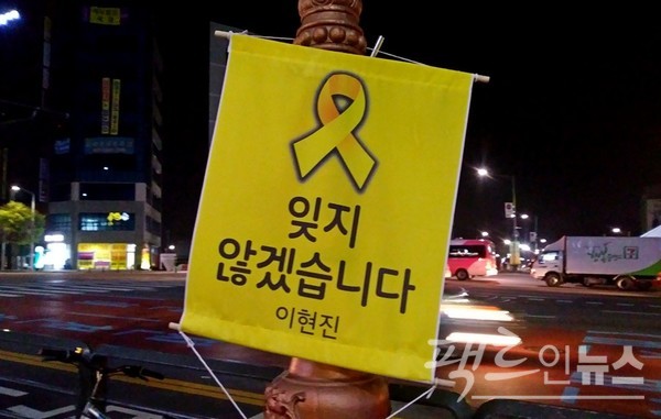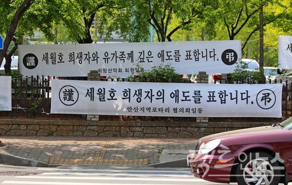 이날 (위부터)단원고 건너 동산과 안산 도심 곳곳에는 단원고 학생과 교사를 비롯해 세월호 희생자를 기리는 현수막이 대거 걸렸다. [사진=정수남 기자]