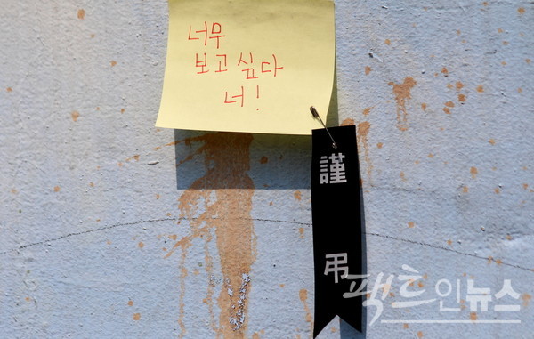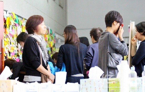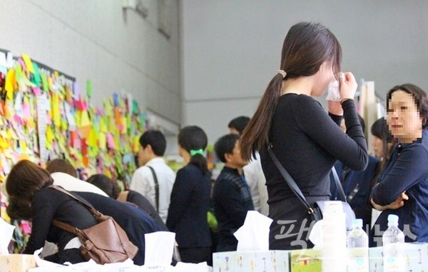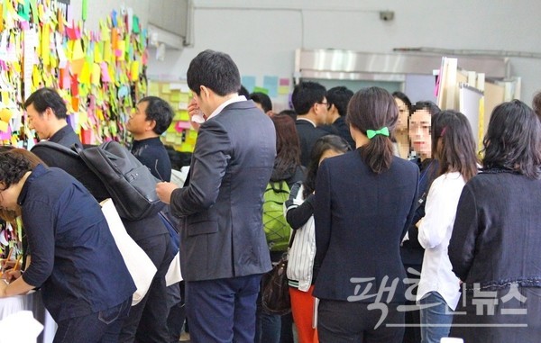 분양소 출구에는 단원고 학생을 추모하는 글이 포스트잇에 쓰여 벽면을 꽉 채웠고, 조문객은 오열했다. [사진=정수남 기자]