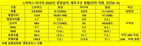 한편, 이디야는 전국에 3800곳 매장을 운영하고 있으며, 스타벅스는 1750곳을 두고 있다. 양사는 전년 실적을 감사보고서로 4월에 공시한다.
