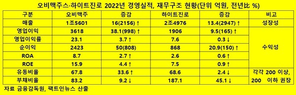 오비맥주의 매출이 하이트진로 매출의 62.5% 수준이지만, 영업이익은 1.9배 많은 셈이다.