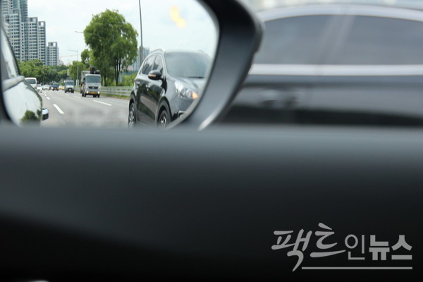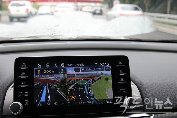 경부고속국도 역시 평일에도 차량이 많다. 옆차선 차량이 갑자기 어코드 하이브리드 앞으로 들어오자, 헤드업디스플레이 하단에 주황색 불이 켜지면서 추돌을 경고한다. 브레이크를 밟으면서 운전대를 돌려 바퀴가 차선을 벗어나자 혼다센싱이 경고음을 낸다. 이들 기능은 모두 계기판에서도 볼 수 있다.