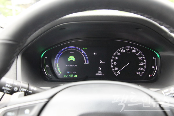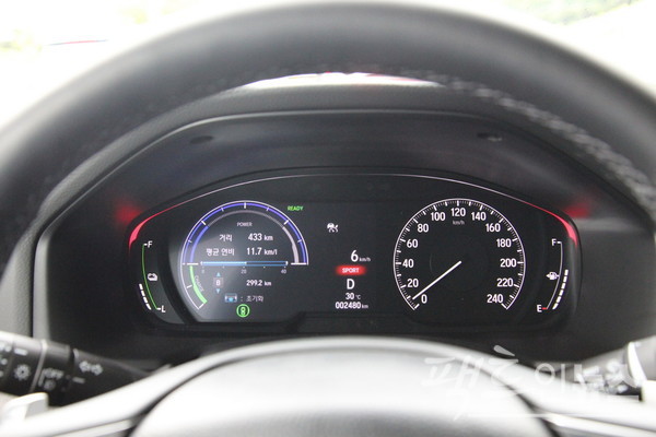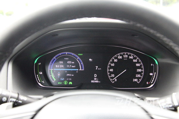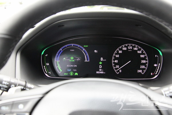 아울러 이번 어코드 하이브리드 역시 계기판이 없는 대신 가속페달을 밟으면 ‘POWER’ 계기판 바늘이 RPM 바늘의 움직임을 대신한다. ‘POWER’ 계기판 바늘이 RPM 바늘의 움직임보다 변동 폭이 커 보는 재미가 있다. 헤드업디스플레이에는 이 ‘POWER’ 계기판 바늘이 가로막대다. 아울러 배터리의 충전 상태도 헤드업디스플레이에 표시된다.
