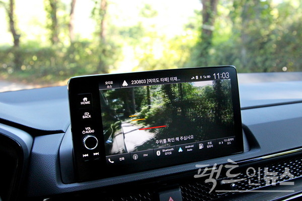 테헤란로와 올림픽로를 거쳐 강변북로를 잡았다. 이곳은 평일에도 차가 많은 곳으로 가다 서기를 반복한다. 다만, 신형 CR-V 터보 우측으로 차량이 붙자, 9인치 모니터에 우측 상황이 자동으로 뜬다. 오른쪽 사이드미러 아래 카메라가 실렸기 때문이다.