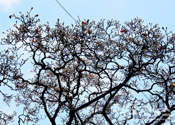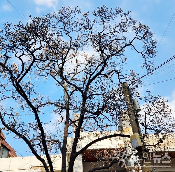 인근 마포구 서교동 주택가다. 줌으로 잡아당긴 목련이 꽃망울을 만들었다. 목련은 통상 4월 초에 꽃을 피운다. [사진/영상=정수남 기자]