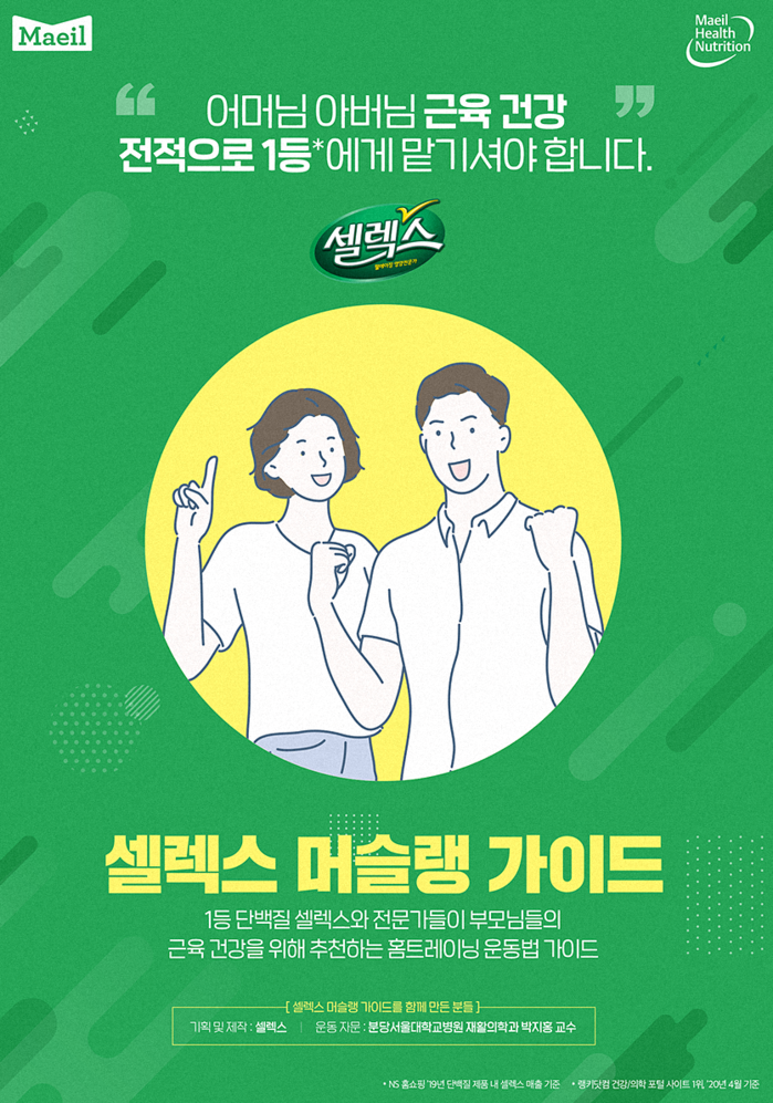 셀렉스 머슬랭가이드는 포스터 형태의 홈트레이닝 가이드로, 박지홍 서울대분당병원 재활의학과 교수의 자문을 받아 부위별 운동법을 소개하고 있다.