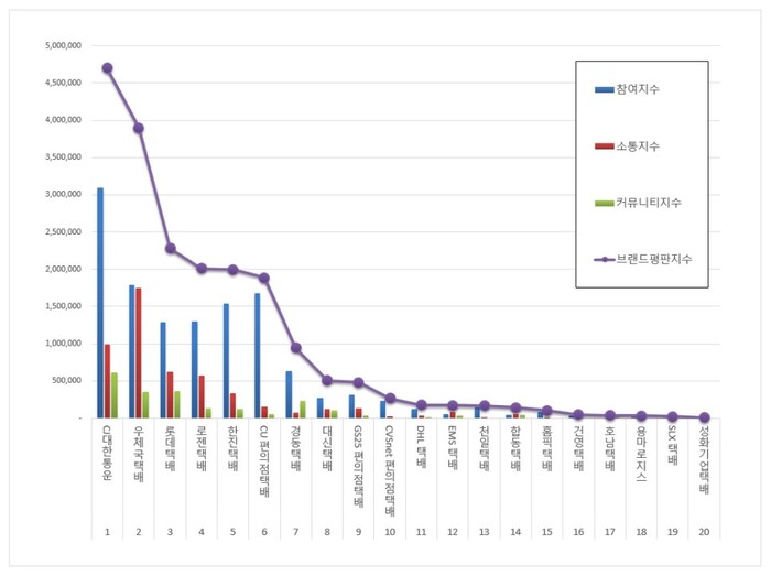 한국기업평판연구소에 따르면 5월 택배 브랜드 평판순위는 CJ대한통운이 1위로, 참여지수 3,097,208 소통지수 989,398 커뮤니티지수 613,971가 되면서 브랜드평판지수 4,700,577를 기록했다.