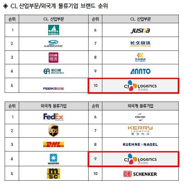 | ▲ CL 산업부문 브랜드 순위 10위(출처=CJ대한통운) |