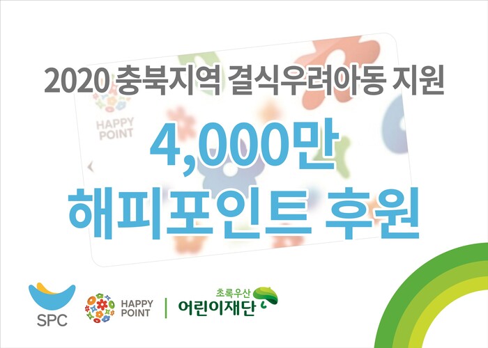 SPC그룹은 초록우산어린이재단과 함께 충북지역 내 저소득가정 아동 310명과 아동복지시설 30곳을 위한 해피포인트 적립카드를 전달했다. 이번 지원을 통해 코로나19로 인한 개학연기 등으로 급식지원을 받지 못하는 아이들은 해피포인트를 파리바게뜨, 배스킨라빈스, 던킨도너츠, 파스쿠찌, 빚은 등 전국 6300여개의 SPC그룹 매장에서 현금처럼 사용할 수 있게 된다.