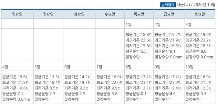 한편 기상청에 따르면 올해 10월 서울 평균 온도는 17도로, 작년 동기간 대비 4.1도 하락해 예년보다 추운 늦가을을 맞이할 것으로 관측된다. 특히 기상청은 오는 14일부턴 최저기온이 10도 이하로 내려가는 등 급격한 기온 변화가 있을 것으로 예측, 따뜻한 옷차림에 신경쓸 것을 권고했다.
