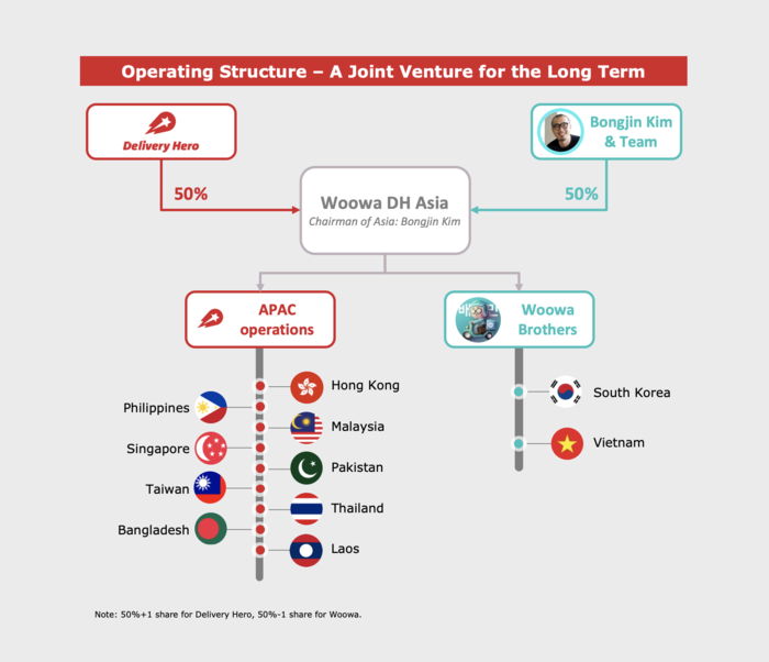 DH와 우아한형제들의 아시아합작법인에 대한 내용도 M&A에 포함돼 있다. 두 기업이 5:5로 출자해 싱가포르에 설립할 예정인 조인트벤처 ‘우아DH아시아’는 대만, 필리핀 등 DH의 아시아 11개국 사업을 총괄한다. 우아DH아시아는 김봉진 의장이 도맡아 이끌 예정이다.