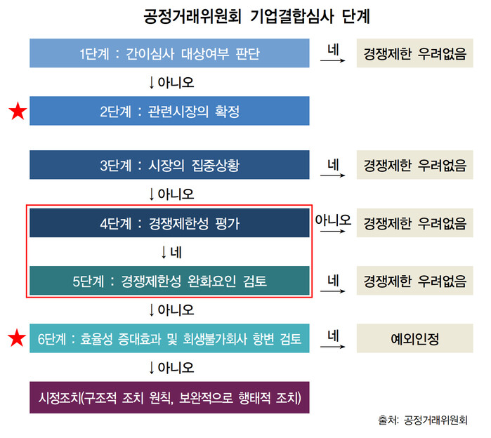 공정위의 기업결합심사는 총 6단계로 이루어진다. 이번 심사에서 업계가 제시한 주요 포인트는 ▲2단계 관련시장의 획정 ▲4·5단계 경쟁제한성 평가 및 완화요인 검토 ▲6단계 효율성 증대효과이다.