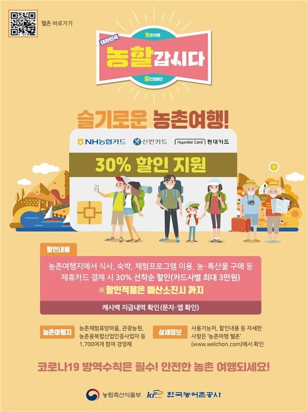 정부는 외식 할인에 더해 농촌 여행 할인 지원 사업도 함께 재개한다. 선착순으로 농촌체험휴양마을, 체험농장 등 농촌관광경영체를 방문해 NH농협·신한·현대카드로 현장 결제하면 결제액의 30%를 캐시백을 돌려받을 수 있다.