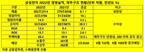 번면, 삼성전자의 지난해 순이익은 55조6541억원으로 전년보다 39.5%(15조7466억원) 급증했다. 이에 따른 삼성전자의 지난해 총자산순이익률(ROA)과 자기자본이익률(ROE) 각각 12.4%, 15.7%로 전년보다 9.4%포인트, 13.1%포인트 상승했다. ROA와 ROE는 영업이익률과 함께 기업의 수익성 지표다.