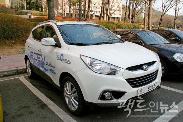 MK는 2010년대 초 수소전기차를 시험 생산해 관용차로 공급했다. 당시 정부과천청사에 있는 투싼 수소 전기차. [사진=정수남 기자]