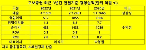 이에 따른 교보증권의 지난해 총자산순이익률(ROA)과 자기자본이익률(ROE)은 각각 0.3%, 2.%로 전년보다 0.09%, 7.5% 떨어졌다. ROA와 ROE는 영업이익률과 함께 기업의 수익성 지표다.