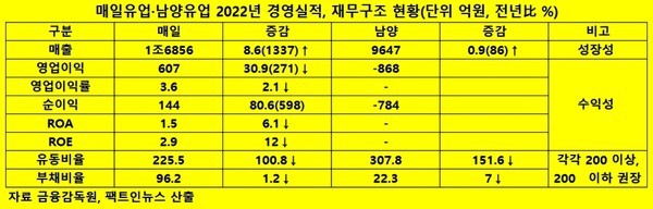 한편, 양사의 지난해 재무는 안정적이다. 유동비율 부문에서 매일유업이 225.5%, 남양유업이 307.8%로, 부채비율의 경우 각각 96.2%, 22.3%로 집계됐다.