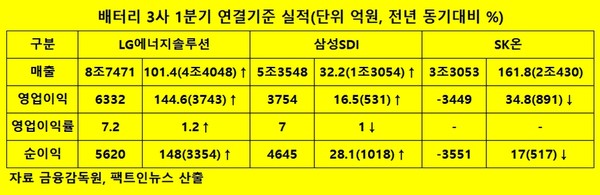 한편, LG에너지솔루션, 삼성SDI, SK온의 1분기 순이익은 각각 5620억원, 4645억원으로 전년 동기보다 148%(3354억원), 28.1%(1018억원) 늘었다. 이기간 SK온의 순손실은 3551억원으로 전년 동기보다 17%(517억원) 악화했다.