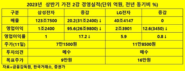 세계 가전 2강인 삼성전자(회장 이재용)와 LG전자가 업황 난조로 올해 실적도 장담할 수 없게 됐다. 다만, 증권가는 이들 업체애대해 투자의견 매수와 목표주가를 상향했다.