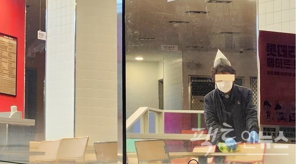 03시경, 성남시 중원구 상대원동에 자리한 24시간 패스트푸드 점에서 밤샘 근무하는 70대 노인이 식탁을 정리하고 있다. [사진= 정수남 기한