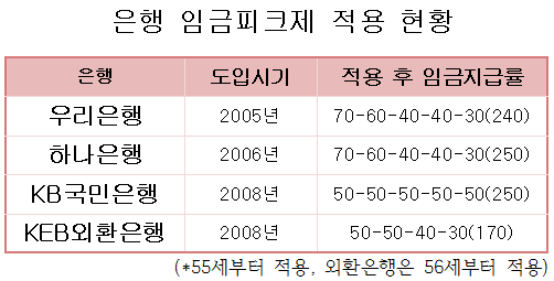 또한 임금피크제는 중장년층 고용보장 면에서도 좋은 성적을 나타내지 못했다. 업계에 따르면 임금피크제 적용 시 5년간 받을 수 있는 임금은 직전 임금의 240~280% 수준인데 대부분의 은행은 이와 맞먹는 퇴직금을 지급해 대상자들이 퇴직을 택한 경우가 많았기 때문이다.
