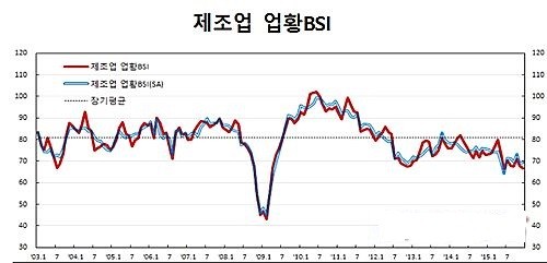 지난 4월 제조업 BSI는 80까지 올라갔지만 6월 메르스 여파로 인해 66까지 추락했다. 이후 ▲7월 70 ▲8월 68 ▲9월 68 ▲10월 71로 상승세를 보였지만 지난달부터 회복세가 꺾인 것이다.