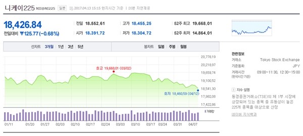13일 닛케이225 지수는 전날대비 0.68%p(125.77)내린 1만 8426.84에 거래를 종료했다. 토픽스 지수도 0.76%p(11.23) 하락한 1468.31에 마감했다.