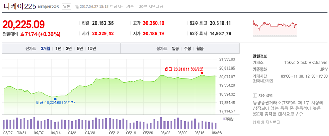27일 도쿄증권거래소(JPX)와 복수 통신사에 따르면 닛케이225지수는 전장대비 0.36%(71.74p) 상승한 2만 225.09에, 토픽수지수는 0.42%(6.81p) 오른 1619.02에 거래 종료했다.