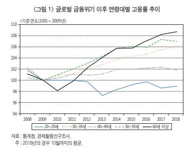 그는 “20대 청년층은 에코 세대가 노동시장에 진입해 생산가능인구가 소폭 증가했으나 금융위기 당시의 회복률을 회복하지 못하고 있어 적극적인 정부의 대응이 없다면 다수의 청년이 취업에 실패할 수 있다”며 “제조업 경쟁력 회복과 고부가가치 서비스 시장 육성을 통한 서비스업 성장을 통해 이들 부문에서의 고용 역량을 강화하는 것이 필요하다”고 말했다.